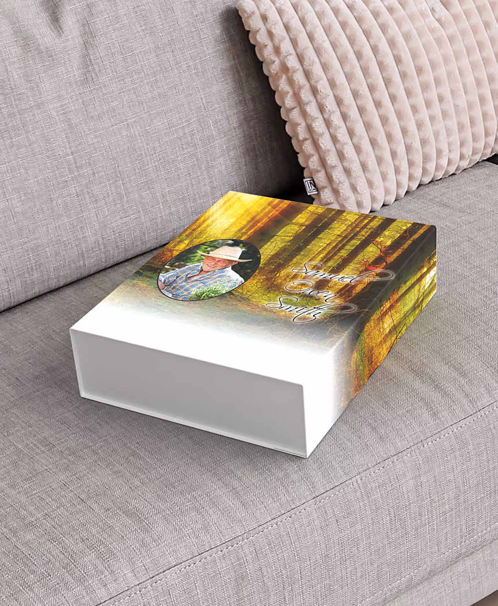 We can create a box personalised to the deceased for that special touch. Our superb quality boxes are made from high-grade materials and have a magnetic clasp on the lid for easy, secure closing. Available in three different sizing options, to suit the family's preference. Please note that this product will take extra time to produce – speak to the team for details.